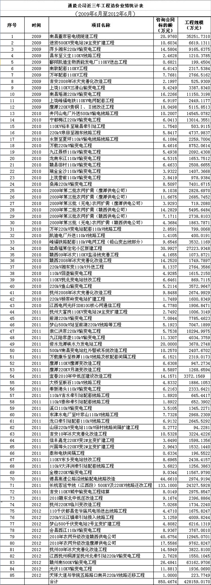 通能公司近三年工程造價業(yè)績統(tǒng)計表